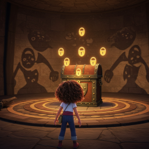 In der Mitte stand eine Truhe, verschlossen mit sieben leuchtenden Schlössern. Ringsum spielten Schatten an den Wänden, sie formten Gestalten von Kindern, die liefen und tanzten.