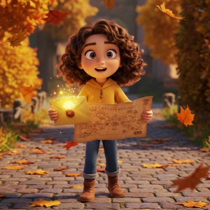 An einem Herbstnachmittag, während Lia spielerisch den fallenden Blättern folgte, stolperte sie über etwas Glänzendes. Auf dem Boden, zwischen zwei Steinen, lag ein goldfarbenes Kuvert. Das Papier fühlte sich warm an, als wäre es erst vor wenigen Minuten dort abgelegt worden.