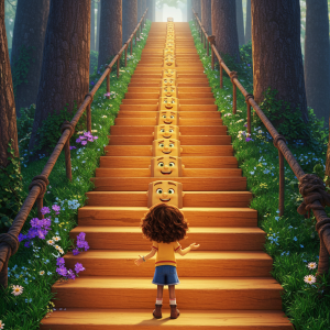 Aber es war keine gewöhnliche Treppe: Ihre Stufen waren aus poliertem Holz gefertigt, und jede trug ein fröhliches Gesicht.